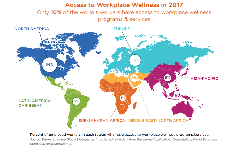 GWI estimates that about 10% of the global workforce is covered by any kind of workplace wellness programs or services. Across the world, workplace wellness is still not a widespread concept, benefiting only a small slice of workers who mostly work for multinational corporations and in knowledge-intensive industries (e.g., finance, investment, consulting, IT, high-tech, higher education, creative industries, etc.), and those living in the world’s wealthiest countries and cities (e.g., North America and Europe).