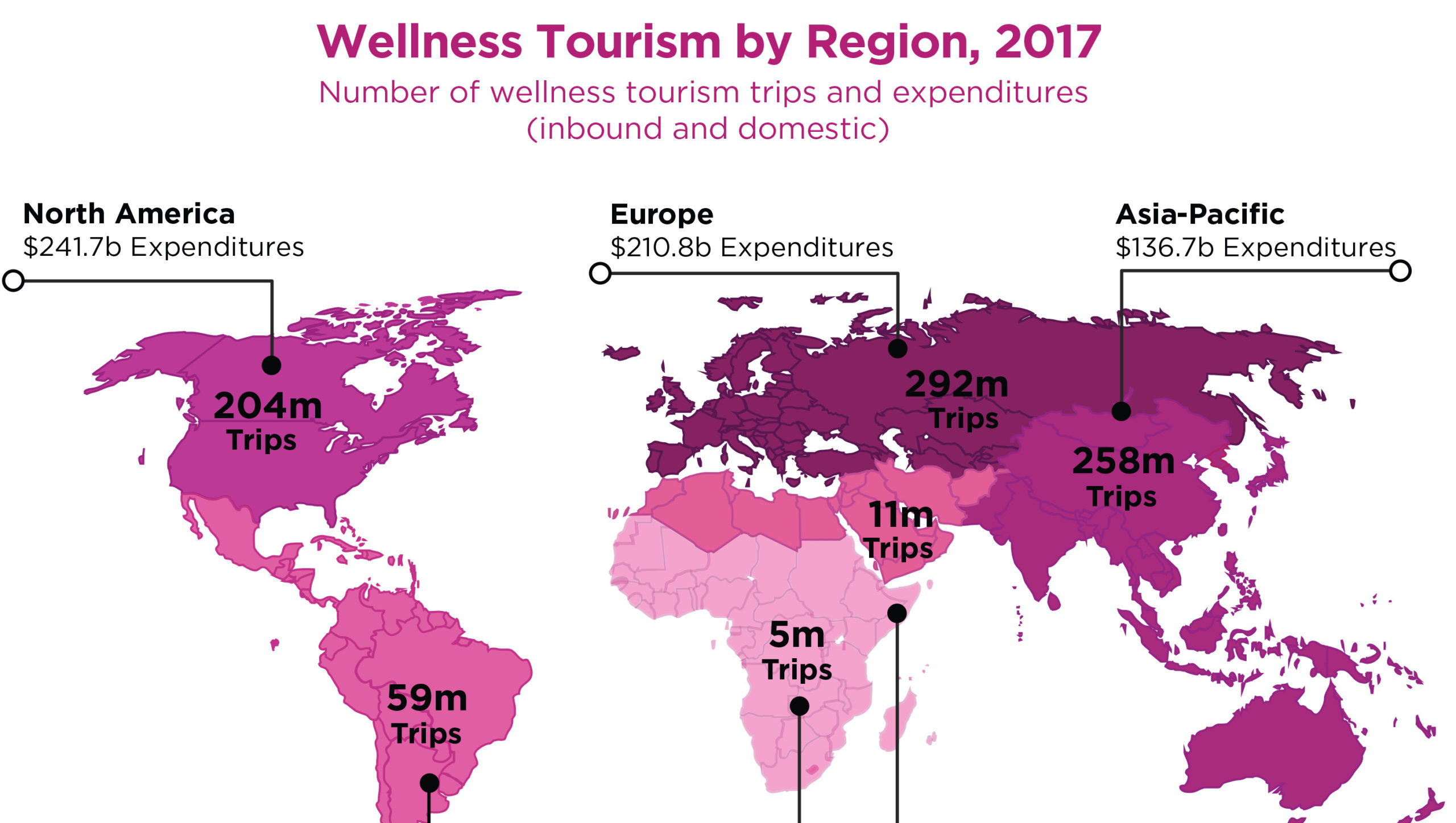 The $639 billion wellness travel market’s annual growth rate of 6.5% from 2015-2017 is more than double the 3.2% growth rate for tourism overall. World travelers made 830 million wellness trips in 2017, 139 million more than in 2015 – and these trips represent 17% of total tourism expenditures. Wellness tourism growth is very much a tale of developing markets, with Asia-Pacific, Latin America-Caribbean, Middle East-North Africa, and Sub-Saharan Africa all clocking robust gains, and accounting for 57% of the increase in wellness trips since 2015. Over the past five years, Asia is the #1 gainer in both wellness tourism trips and revenues (trips grew a whopping 33% in two years, to 258 million annually). China and India rank #1 and #2 for growth worldwide, adding over 12 million and 17 million wellness trips respectively from 2015-2017.