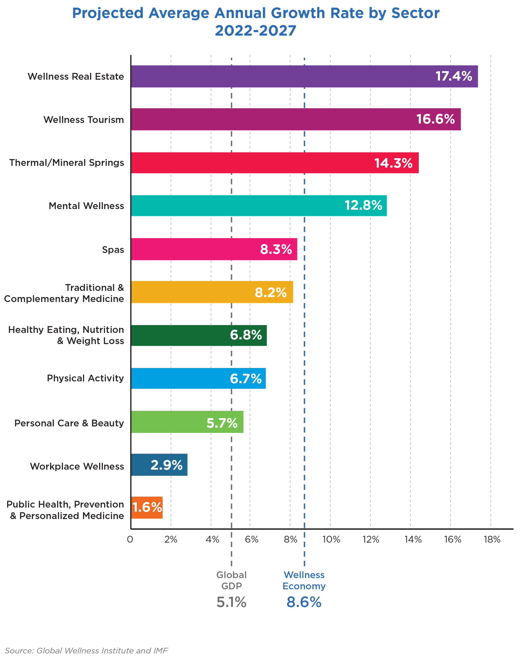 For the next five years, we project that the global wellness economy will grow at a robust rate of 8.6% annually, a growth rate substantially higher than the projected global GDP growth (5.1% according to current IMF forecasts).