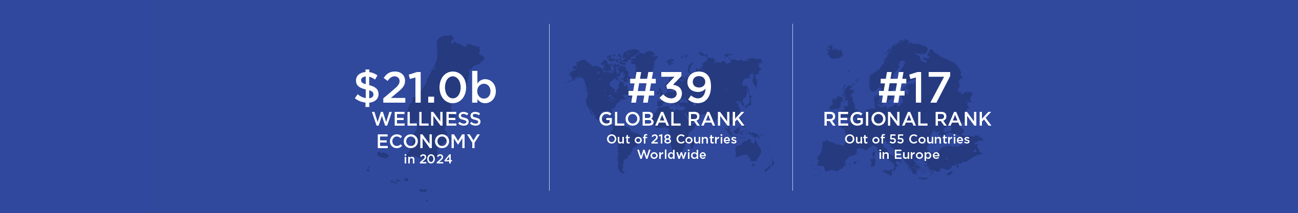 The wellness economy, as defined by GWI, is broad and diverse. Its eleven sectors encompass many different types of consumer activities and expenditures, including products, services, travel, and technology. Every country’s wellness economy is unique. Its composition can vary widely from country to country, based on its development history, culture, socioeconomic conditions, and government policy. Below we present Portugal’s top-line wellness economy data and how it ranks globally. More details are available in the downloadable country report.