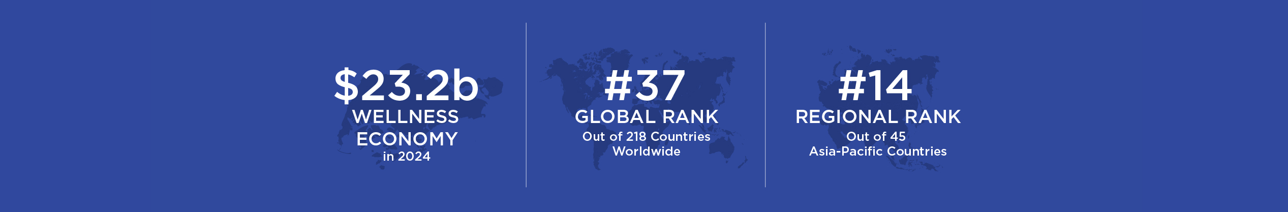 The wellness economy, as defined by GWI, is broad and diverse. Its eleven sectors encompass many different types of consumer activities and expenditures, including products, services, travel, and technology. Every country’s wellness economy is unique. Its composition can vary widely from country to country, based on its development history, culture, socioeconomic conditions, and government policy. Below we present Singapore’s top-line wellness economy data and how it ranks globally. More details are available in the downloadable country report.