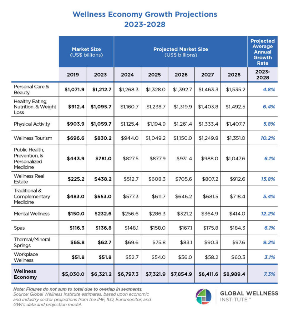 Because the trends fueling the wellness economy will only accelerate—an aging population, chronic disease, widespread mental unwellness—the GWI predicts that the industry will grow a rapid 7.3% annually from 2023 to 2028, when it will represent 6.8% of global GDP. The market will reach nearly $6.8 trillion in 2024 and nearly $9 trillion in 2028 (nearly double its 2019 size).
