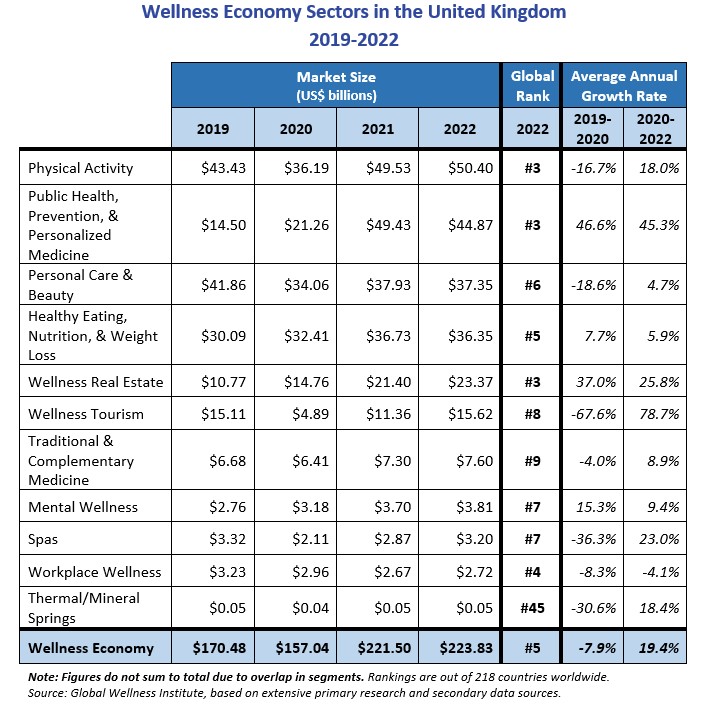 The UK ranks #1 globally for growth in its wellness market when compared with 2019. The UK market was nearly one-third larger in 2022 than it was in 2019.