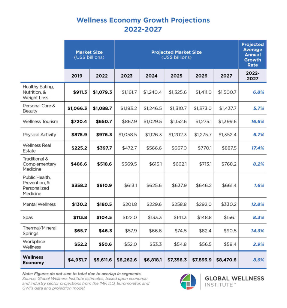 Miami, FL – November 7, 2023 – How has the global wellness economy fared since the massive economic shocks of the pandemic? According to a new report released today by the non-profit Global Wellness Institute (GWI)—the only authoritative, comprehensive source of wellness market data—the industry has made one powerful recovery. If the market was worth a record $4.9 trillion in 2019, and then shrank 11% to $4.4 trillion in the pandemic year of 2020, the research indicates that the wellness economy has seen recent, economy-defying momentum. It grew 27% since 2020 to reach $5.6 trillion, with 7 of the 11 wellness sectors now surpassing their 2019, pre-pandemic values. With consumers, the medical world, and governments now placing a much bigger value on prevention and wellness, the GWI forecasts that the wellness economy will grow at an impressive 8.6% annual pace through 2027, when the market will reach $8.5 trillion—nearly double its 2020 size.