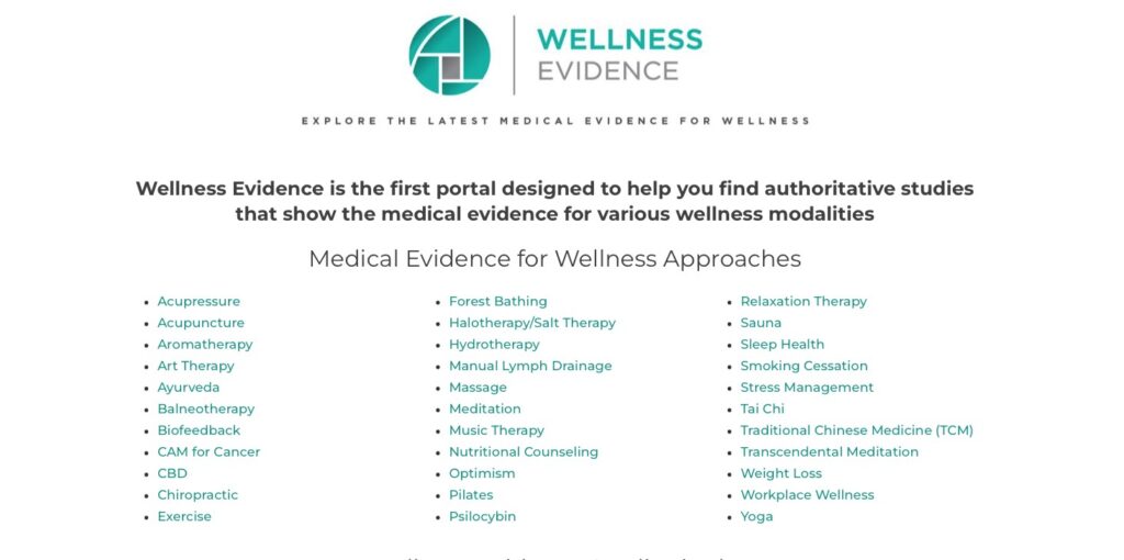 Created by the Global Wellness Institute, WellnessEvidence.com is the only website that provides people with independent scientific research on 30+ popular wellness modalities, from acupressure and massage to psilocybin and yoga