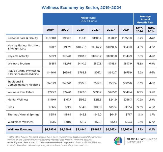 Miami, FL – November 19, 2025 –The Global Wellness Institute (GWI) today released the Global Wellness Economy Monitor 2025, the only research that provides authoritative, in-depth data and insights on the global wellness market and each of its 11 sectors. The story emerging from the data: continued, accelerating growth. The wellness market has doubled since 2013, and grew 7.9% from 2023 to 2024, reaching a new peak of $6.8 trillion. The market is officially beyond “pandemic recovery mode”: all 11 wellness sectors now exceed their 2019 values, most by significant margins. By far the fastest growing segments are wellness estate and mental wellness, expanding at 19.5% and 12.4% annually, respectively, from 2019 to 2024. The only stagnant market: workplace wellness, with global spending shrinking by 1.5% from 2023 to 2024. Every regional wellness market has experienced major growth over the last five years, with North America (7.9%), Middle East-North Africa (7.2%) and Europe (6.3%) posting the biggest annual gains.